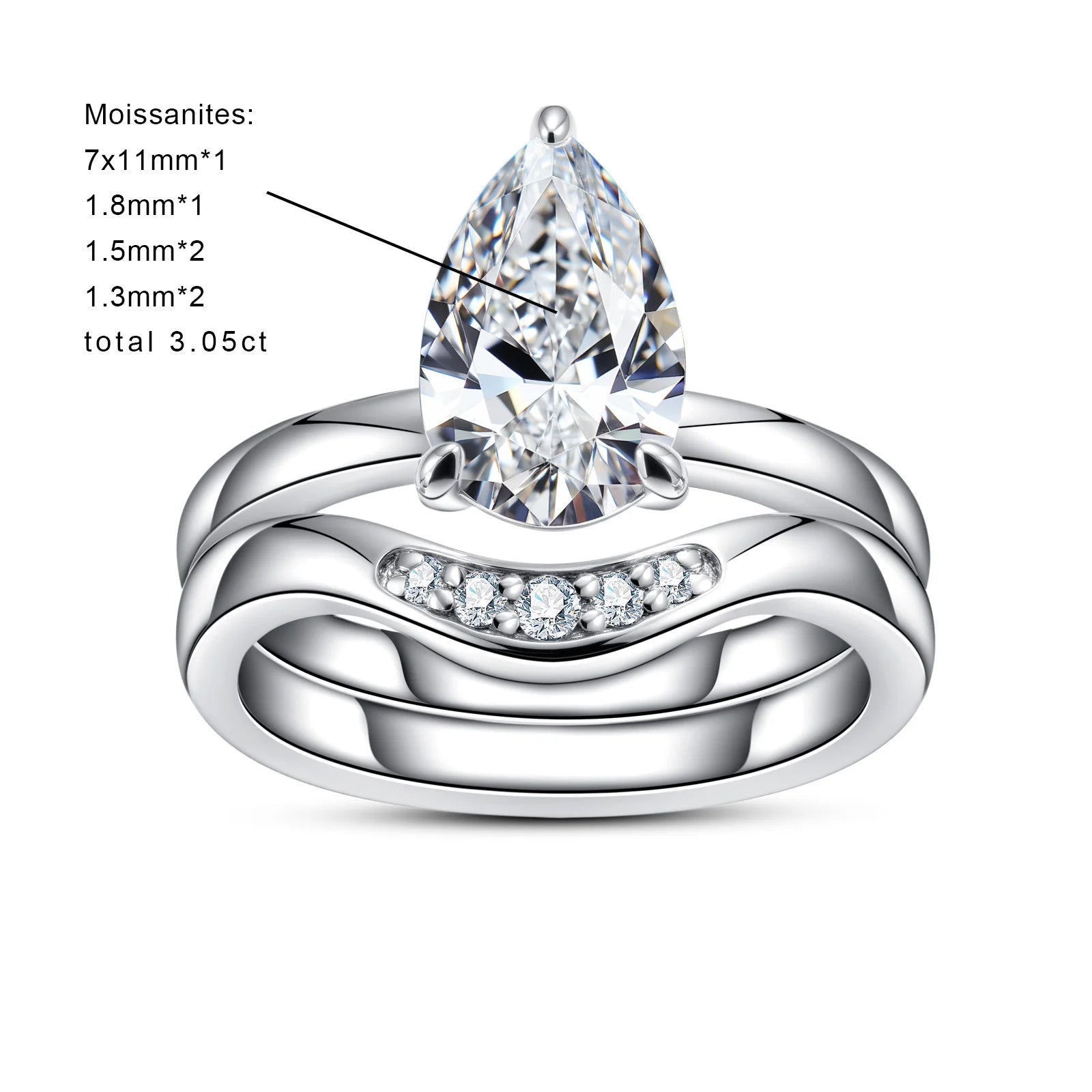The Floriane blends timeless romance with delicate artistry. At its center, a captivating 3.0ct pear-cut moissanite glows with brilliant intensity, gracefully elongated for a refined silhouette. Complementing this solitaire is a refined half-eternity band, set with five miniature moissanites that form a subtle "V" contour, an elegant touch that completes the set with balance and charm. Together, they evoke a harmony of boldness and subtlety, designed for modern elegance.